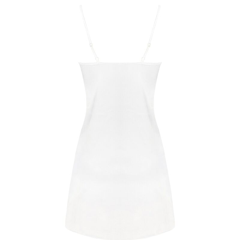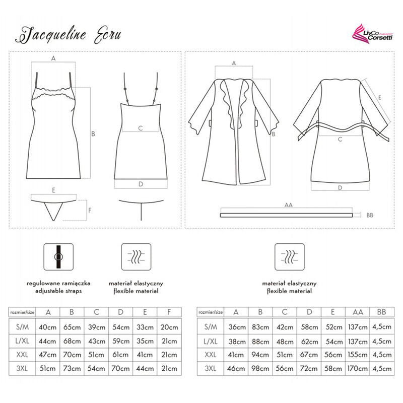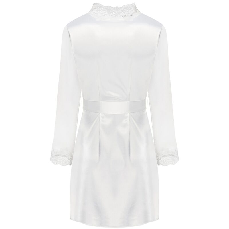 Un conjunto de ropa interior excepcionalmente hermoso, confeccionado en satén crudo brillante. Incluye una bata con camisola hasta la mitad del muslo. La parte delantera y las mangas largas de la bata, atadas a la cintura con un cinturón, están decoradas con un hermoso encaje. La camiseta, con tirantes finos y ajustables, está decorada con el mismo encaje en el busto. Incluye tanga.