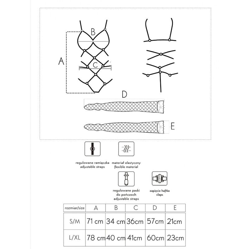 La parte superior del conjunto consta de sensuales rayas negras entrelazadas en el vientre y unidas con anillas. Los tirantes de la parte superior rodean elegantemente el busto sin taparlo, mientras que la inferior se transforma delicadamente en un tanga. Tirantes individuales recorren ambos lados del tanga, ceñindo con encanto las caderas. La parte inferior del conjunto consta de medias negras de malla de largo ajustable. Las medias se sujetan con broches a la parte superior del conjunto, por delante y por detrás.